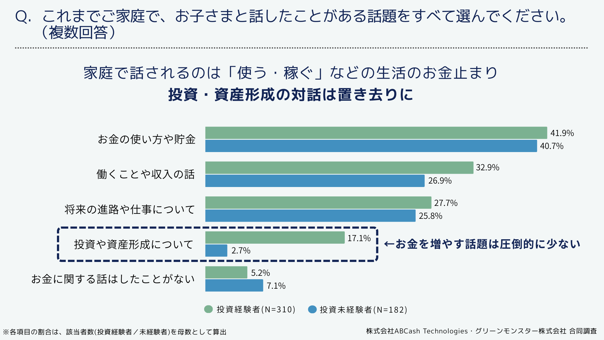- 家庭内で「投資や資産形成」について子どもと話している割合は、投資経験者で17.1%、投資未経験者では2.7%にとどまり、家庭内で投資を話題にする機会自体が限定的である実態が示された。