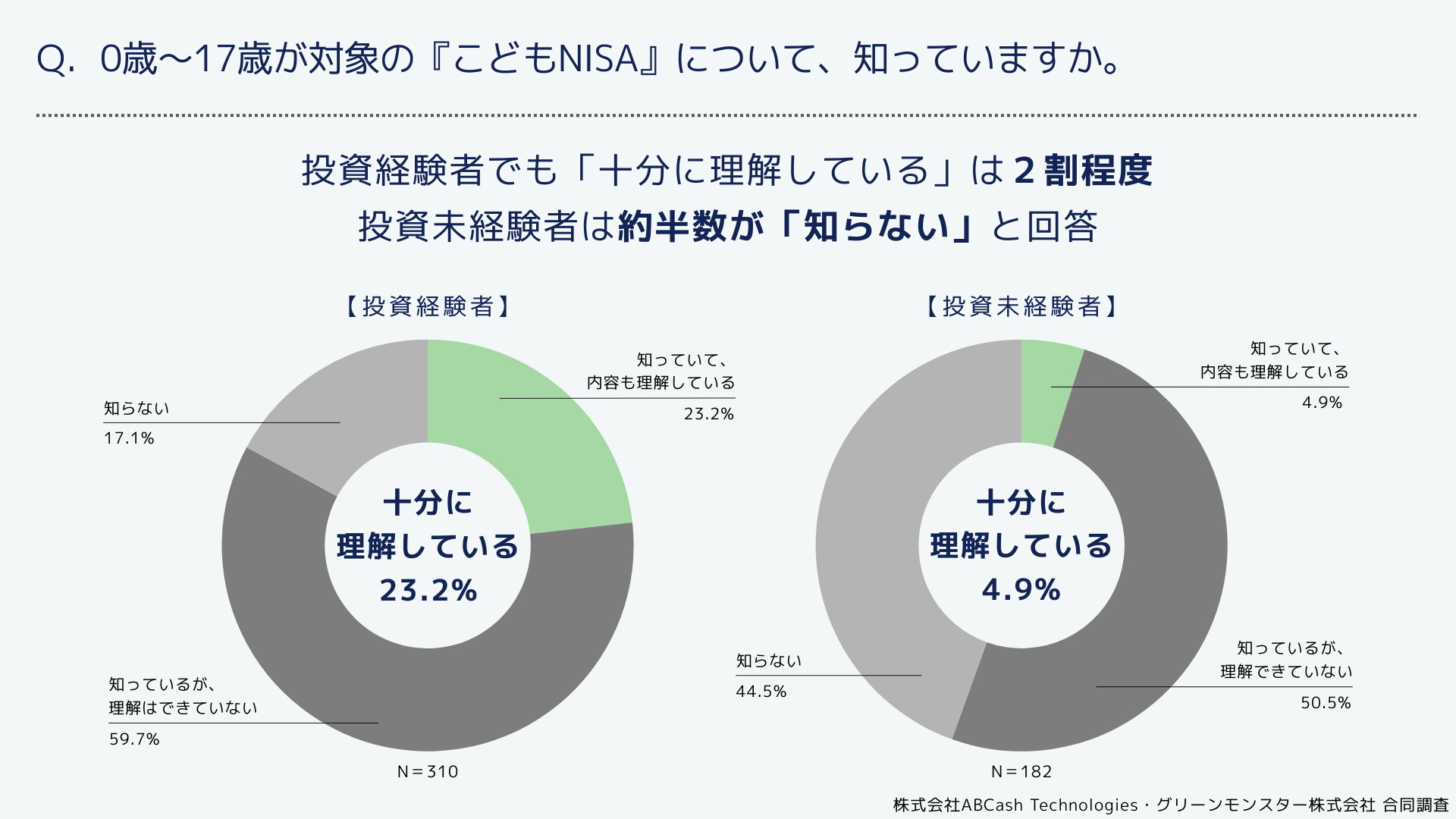 グリーンモンスター株式会社(本社:東京都渋谷区、 代表取締役:小川 亮、証券コード:157A、以下グリーンモンスター)は、株式会社ABCash Technologies(本社:東京都渋谷区、代表取締役社長:辻 侑吾)と合同で、18歳未満の子どもを持つ保護者492名を対象に『こどもNISA』に関する意識調査を実施いたしました。その結果、こどもNISAの利用意向は全体で半数未満にとどまり、投資経験の有無によって制度への向き合い方や不安の内容に違いがあることが明らかになりました。