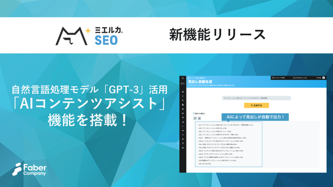 株式会社Faber Companyは2023年2月15日(水)、今話題の自然言語処理モデルGPT-3を活用した「AIコンテンツアシスト」機能をアルファリリースしたことをお知らせいたします。本機能では、世間一般のインターネットにある情報だけではなく、各社の属する業界情報やWebサイトにある情報・コンテンツなどを学習・チューニングし、各社のWebサイトやオウンドメディアに合わせたコンテンツ案を提案いたします。アルファリリースにおいては、まずコンテンツタイトル案からコンテンツ構成(見出し構成)を提案する機能を提供します。
