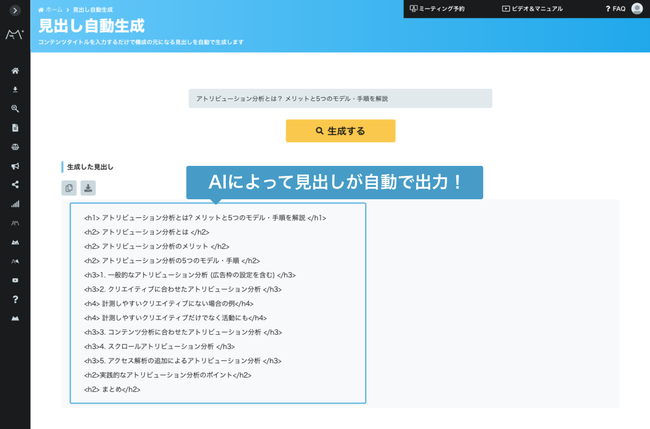 出力の度にミエルカから提案される内容は変化しますので、コンテンツ構成や見出しの内容を考える上でのヒントに活用することができます。