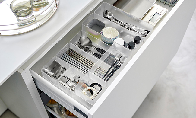 各サイズがきれいにスタッキングできるので、 収納したいものによっていろいろな組み合わせができます。