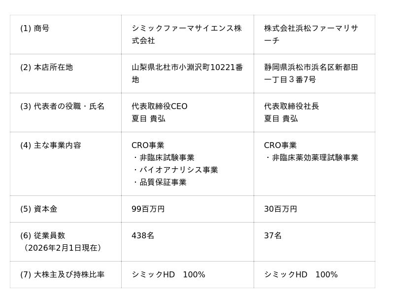 当社子会社のシミックファーマサイエンス株式会社(本社:山梨県北杜市、代表取締役CEO 夏目 貴弘、以下:シミックファーマサイエンス)と株式会社浜松ファーマリサーチ(本社:静岡県浜松市、代表取締役社長 夏目 貴弘、以下:浜松ファーマリサーチ)は、シミックファーマサイエンスを存続会社、浜松ファーマリサーチを消滅会社とする吸収合併により統合することといたしましたので、お知らせいたします。