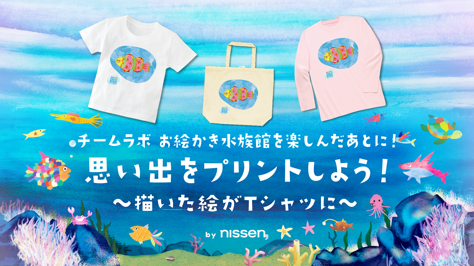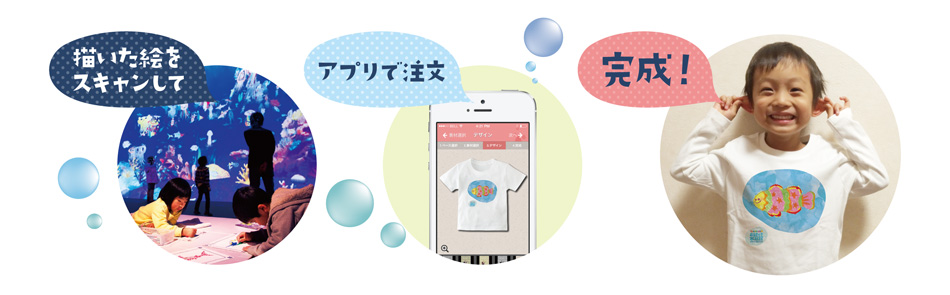 『チームラボ 踊る!アート展と、学ぶ!未来の遊園地』(日本科学未来館)にて、「お絵かき水族館」(※1)で描いた魚がオリジナル背景と共に「Tシャツ」や「トートバック」になるサービス「思い出プリント」を、株式会社ニッセンと土日祝日限定で開始しました。