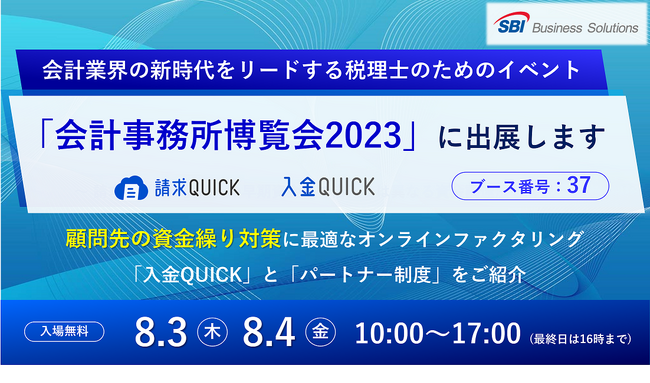 本博覧会の展示において当社は、税理士・会計事務所様の顧問先やお取引先の資金繰り対策に適した資金調達方法であるオンラインファクタリングサービス「入金QUICK」のご紹介と、「紹介パートナープログラム」のご案内をいたします。また、8月4日(金) 12:00〜12:10に当社代表の夏川による「顧問先の資金繰り支援ならSBIの入金QUICK!」のミニセミナーも予定しております。