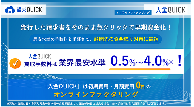 「入金QUICK」は中小企業の資金調達の常識を変えることを目指し、業界最安水準の手数料0.5%〜4.0%*1で提供する「請求QUICK」のオンラインファクタリングサービスです。