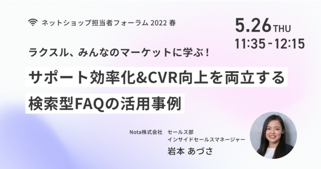革新的な検索型FAQ「Helpfeel(ヘルプフィール)」( https://helpfeel.com/ )を提供しているNota株式会社(京都府京都市 代表取締役/CEO:洛西一周 以下、Nota)はこのたび、株式会社インプレス(本社:東京都千代田区、代表取締役社長 小川亨 以下、インプレス)が主催する「ネットショップ担当者フォーラム 2022 春 〜eコマース コミュニケーションDay〜」にNota株式会社 セールス部 インサイドセールスマネージャーの岩本 あづさが登壇することをお知らせ致します。