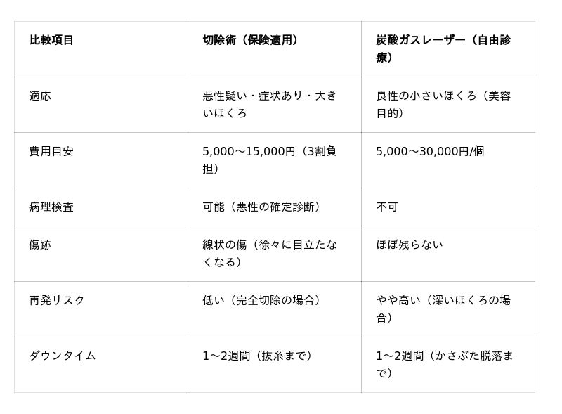 ほくろ除去の治療法比較(保険診療と自由診療)
