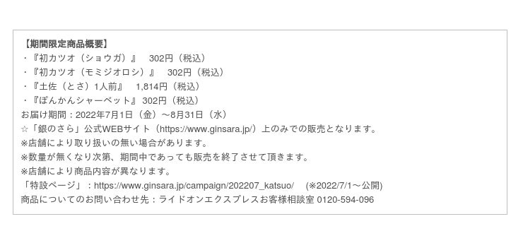 ※販売特設ページ:https://www.ginsara.jp/campaign/202207_katsuo/ (※2022/7/1〜公開)