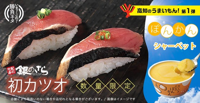 株式会社ライドオンエクスプレスホールディングス(本社:東京都港区、代表取締役社長 江見 朗)は、グループ企業が展開する、宅配寿司「銀のさら」において、【高知のうまいもん!第1弾】として、高知県産『初カツオ』と『ぽんかんシャーベット』を、公式WEBサイト限定で、2022年7月1日(金)〜8月31日(水)の期間、数量限定で販売いたします。