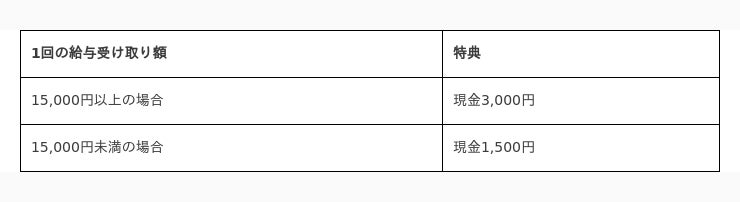 期間中にみんなの銀行で給与または賞与を受け取った方に、下表のとおり1回あたりの受け取り額に応じてもれなく現金をプレゼントします