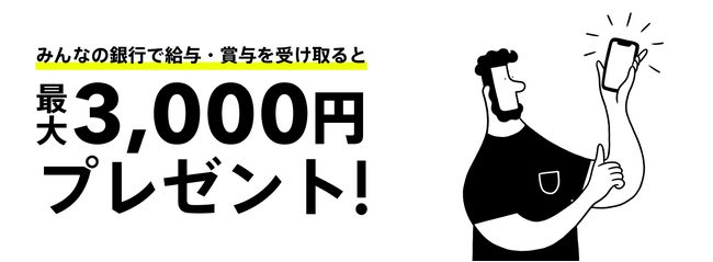キャンペーン期間中にみんなの銀行口座で給与または賞与を受け取ったお客さまを対象に、最大3,000円をプレゼントします。