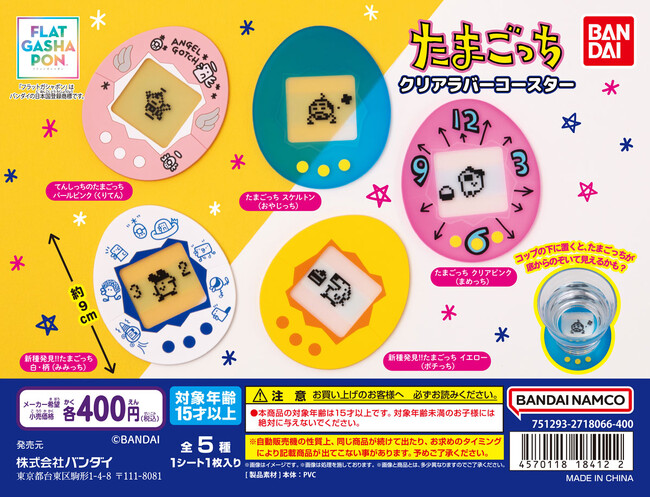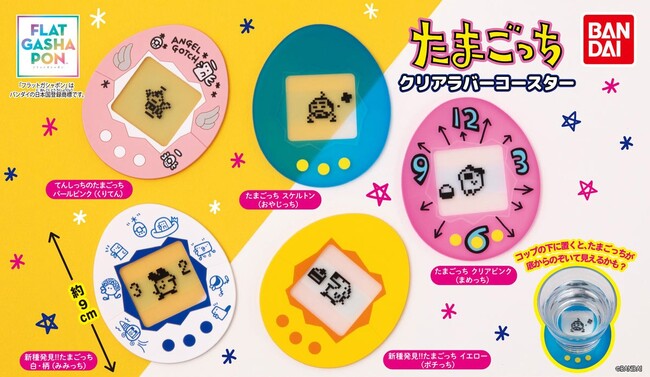 株式会社バンダイ ベンダー事業部(本社:東京都台東区)は、1996年に発売した携帯型育成玩具「たまごっち」の形を模したコースター「たまごっち クリアラバーコースター」(1回400円・税10%込、全5種)を2023年12月第3週から順次、全国のガシャポンバンダイオフィシャルショップ、玩具売場、量販店、家電店などに設置された最大A4サイズ、厚さ1cmまでの平面商材が出てくる「フラットガシャポン(R)」にて発売いたします。
