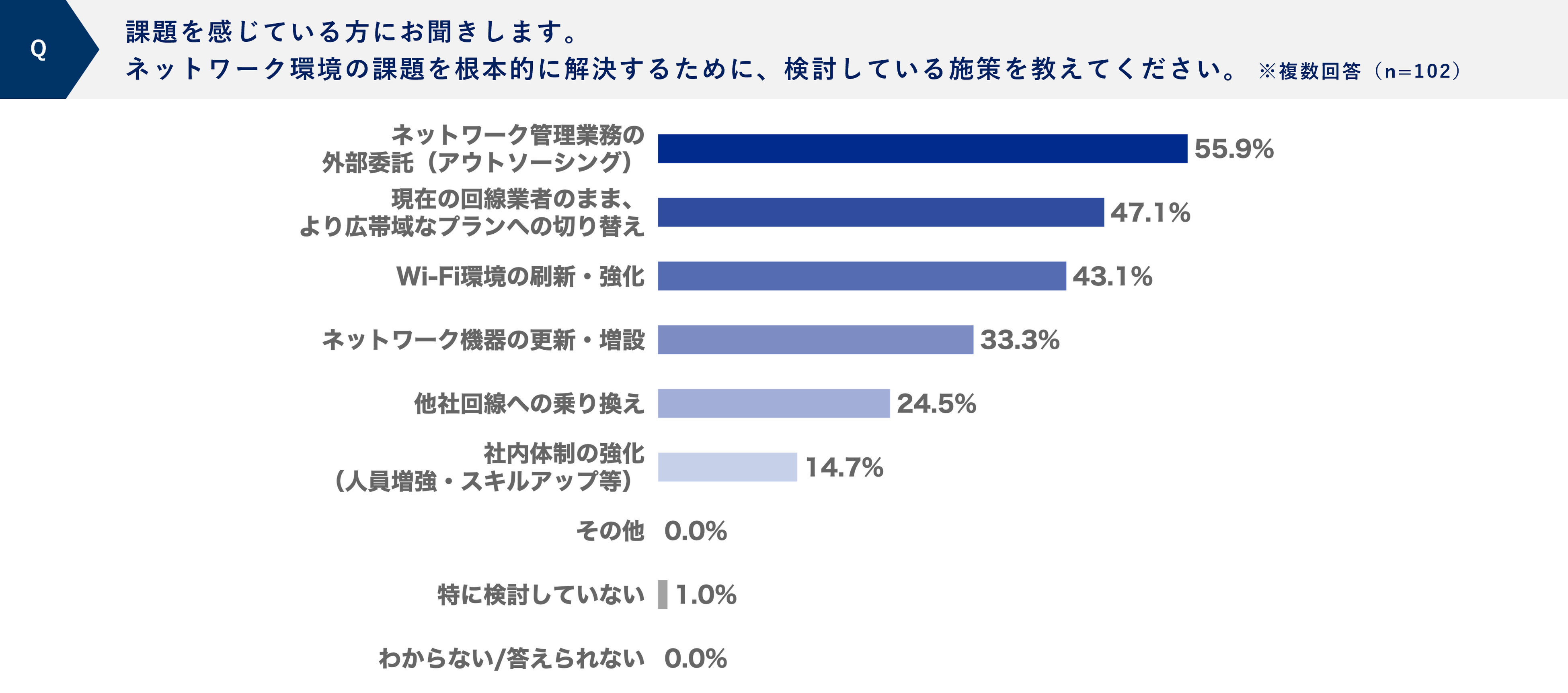 こうした課題を根本的に解決するために、55.9%の担当者が「ネットワーク管理業務の外部委託」を検討しており、ネットワーク環境を見直すことで「IT部門の負担軽減」(52.9%)や「セキュアな通信環境」(49.0%)を実現したいことが分かりました。