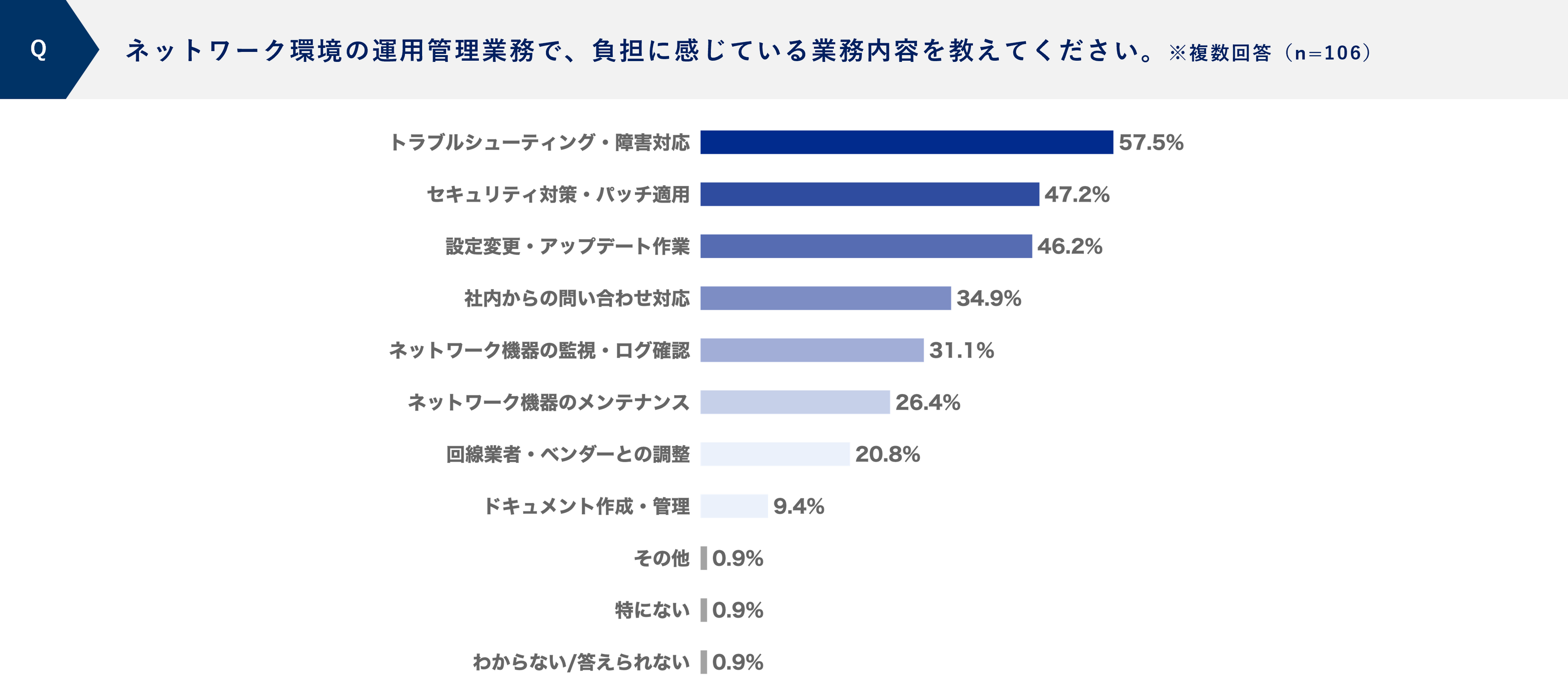 また、48.2%がネットワーク環境の運用管理業務に「週5時間以上」を費やしていると回答。具体的には、「トラブルシューティング・障害対応」が57.5%と最多で、次いで「セキュリティ対策・パッチ適応」(47.2%)、「設定変更・アップデート作業」(46.2%)となりました。