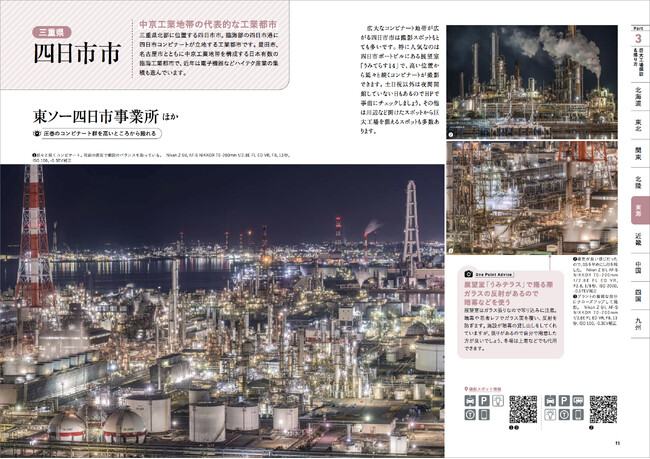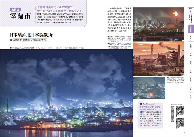 本書では、撮影の技法解説はコンパクトにまとめて、ガイド本としての役割を重視した構成になっています。ガイドのページに掲載した写真には短い解説と撮影データが添えられ、適宜ワンポイントアドバイスが入ります。巻頭は小林氏の工場写真ギャラリーになっていて、写真集としても楽しめます。工場を見に行くための本ですが、なかなか行けない場所は写真を見て行った気分になるのも一興です。