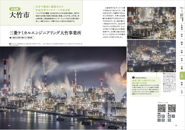 著者の小林哲朗氏は「身近な異世界」をテーマに、巨大工場や巨大建築物、地下空間、廃墟などを撮影した写真を発表しています。中でも工場は重要なテーマとなっており、これまでに工場の写真集を3冊と、工場撮影の技法書を刊行しています。そんな小林氏が満を持して上梓するのが本書。日本全国の工場を訪ね撮り歩いた中から、45都市・114の撮影ポイントを選び、そこで撮った写真とともに情報を紹介します。