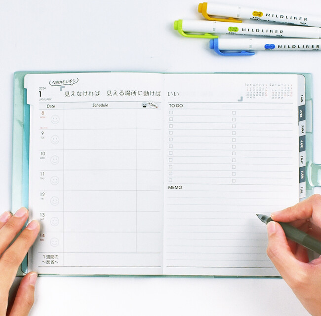 手帳内に時間を管理する時間軸はなく、その日の気持ちや1週間でやる事・やりたい事をメモするページで構成されています。
