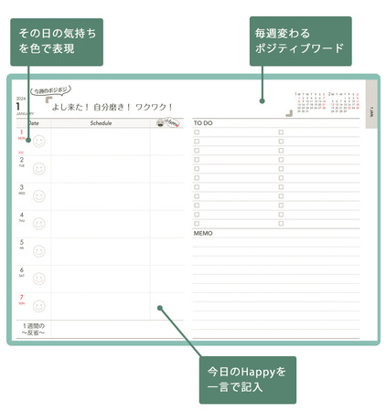 ページ上部。一番目につくところに週替わりのポジティブワードが書かれています。気持ちが少し下がり気味のときはこのポジティブワードを声に出してみてください。