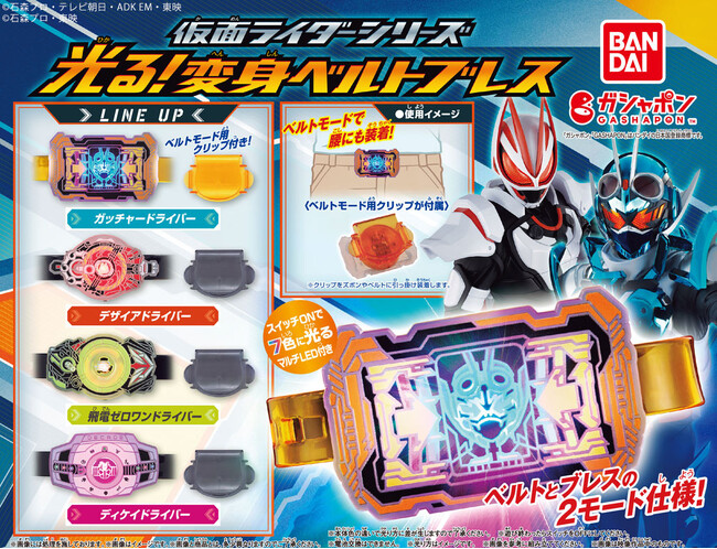 本商品は、仮面ライダーシリーズの変身ベルトをミニチュアサイズで再現した「ガシャポン(R)」初登場のアイテムです。各シリーズの変身ベルトを模したデザインになっていて、バックル部分のスイッチを押すとLEDライトが7色に発光する豪華仕様となっています。ベルトモードとブレスモードの2モード仕様となっているので、いつでもどこでも変身遊びをお楽しみいただくことが可能です。