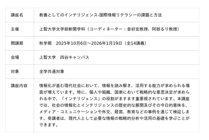 上智大学での連携講座は本年度で11回目の開講となり、当講座は現代人が身に着けるべき教養として、情報の戦略的な分析、活用の基礎を学ぶことを目的に上智大学文学部新聞学科音好宏教授、阿部るり教授のご指導のもと開講しております。