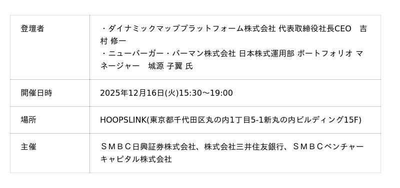 自動運転地図のダイナミックマッププラットフォーム株式会社(本社:東京都渋谷区、以下「当社」)は、2025年12月16日(火)に開催されたネットワーキングイベント「未来X(mirai cross) CFO倶楽部」に、当社代表取締役社長CEOの吉村 修一が登壇しましたことをお知らせします。