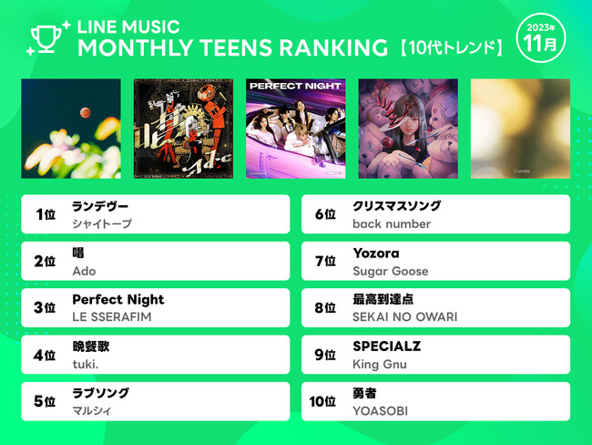2位には9月に総合と10代ランキングで2冠の1位に輝いた、大阪在住の3ピースバンドシャイトープの「ランデヴー」が先月3位から順位を上げて、ランクイン。LINE MUSICの2023年トレンドアワードにも輝き、今度の活動に注目が集まっています。