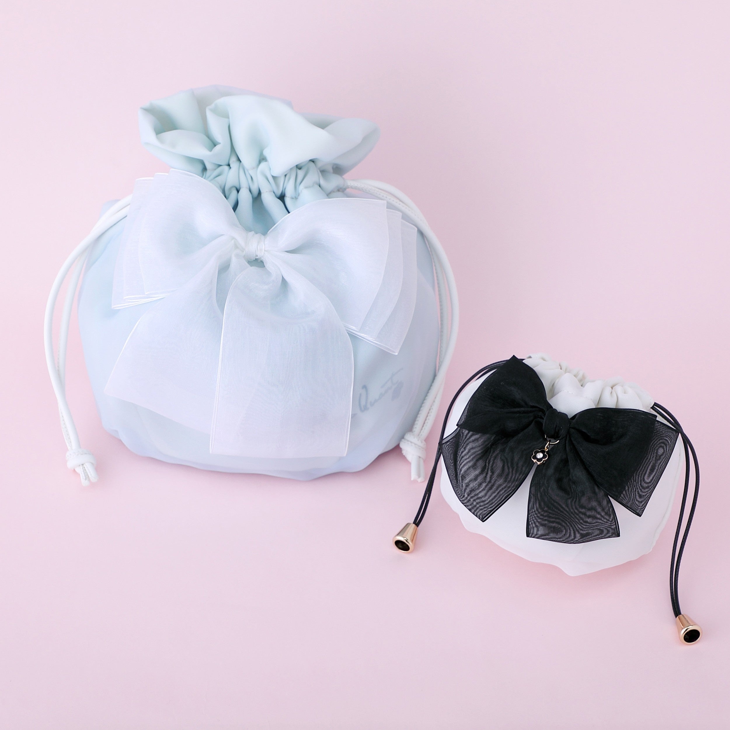 オーガンジーリボンを付けたシアーなショルダーバッグやポーチなど