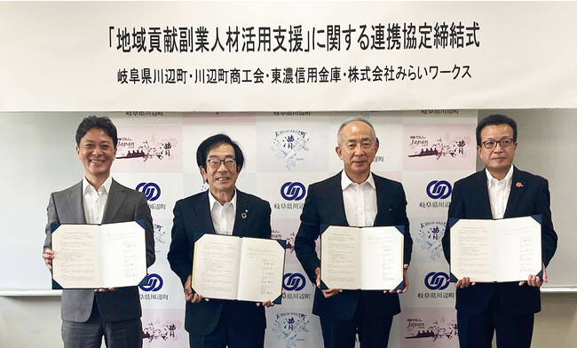 プロフェッショナル人材のフリーランス・副業といった多様な働き方をサポートする株式会社みらいワークス(本社:東京都港区、代表取締役社長:岡本祥治、証券コード:6563、以下「当社」)は、人材支援による地域企業の事業強化ならびに関係人口(※1)創出を目的とし、岐阜県加茂郡川辺町(町長:佐藤光宏)、川辺町商工会(会長:佐伯敏充)、東濃信用金庫(理事長:加知康之)と、副業・兼業プロ人材の活用を推進することをお知らせいたします。