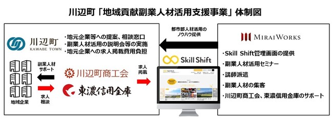川辺町商工会と東濃信用金庫が、人材不足に課題を抱える企業に、『副業・兼業人材の活用』をご紹介し、企業は経営課題を解決するための求人情報を『Skill Shift』に掲載します。川辺町は事業推進のために、本来、『Skill Shift』の利用にかかる求人掲載費用の全額を負担します。当社は、『Skill Shift』管理画面の提供、副業・兼業人材活用セミナーの開催、副業・兼業人材の集客、副業・兼業人材活性化のサポートを実施し、今後、本仕組みの定着・自走化を進めていくための足掛かりとして、プロジェクトをサポートいたします。