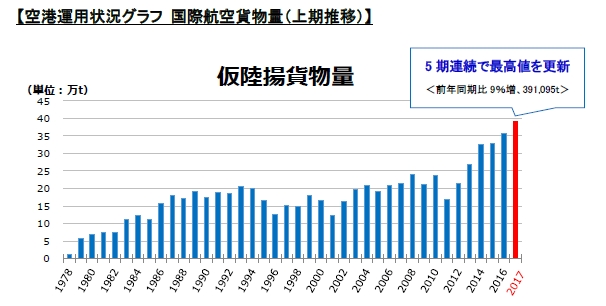 アトラスエア、インドネシア・エアアジアXなど新規乗り入れが10社あったこと、また韓国、香港などのアジア方面を中心とした新規就航や増便が相次いだことで旅客便が好調となり、前年同期比3%増の96,819回と2016年から2期連続で最高値を更新。