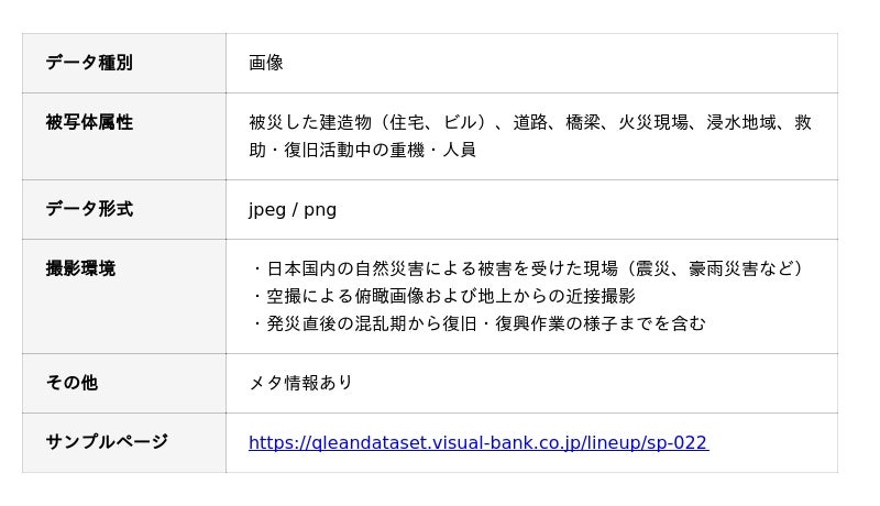 Visual Bank株式会社(東京都港区、代表取締役CEO 永井真之)は、傘下の株式会社アマナイメージズを通じて展開するAI学習用データソリューション「Qlean Dataset(キュリンデータセット)」において、画像認識精度の向上や、複雑な被災状況の言語理解を目的としたマルチモーダルモデル(LMM)の学習に最適化された、「日本の災害画像データセット」の提供を開始します。