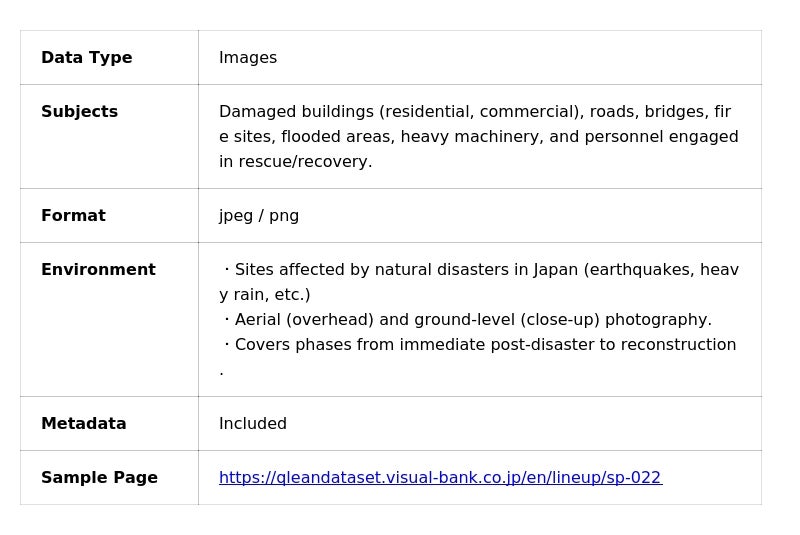 Visual Bank Inc. (Minato-ku, Tokyo; Saneyuki Nagai, Representative Director and CEO), through its subsidiary amana images inc., has announced the release of the "Japan Natural Disaster Image Dataset." This dataset is part of their AI training data solution, "Qlean Dataset," and is specifically optimized for training Large Multimodal Models (LMMs) and improving image recognition accuracy in complex disaster scenarios.