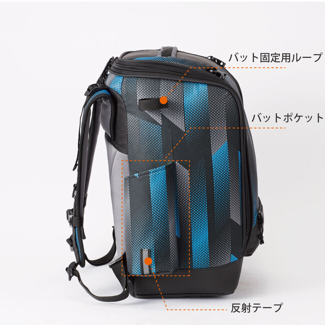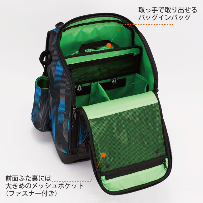 新発想のバッグインバッグを採用。ヘルメットの外付け用パーツや、巾着タイプのポケット、水筒のサイズによって調整可能な仕切りを付けたポケット、保冷機能を付けたお弁当用のスペースなどお子様が楽しみながら整理して大事な用具を持ち運べるよう工夫が施されています。
