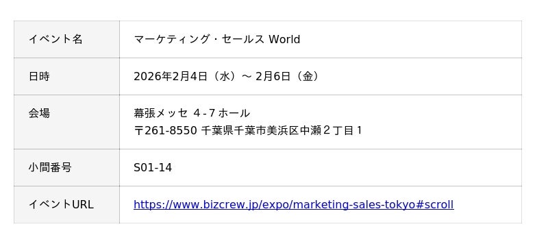 「マーケティング・セールス World 2026 春 東京」は、企業・店舗の営業およびマーケティングの課題解決をする最新ソリューションを一堂に集めたイベントです。
