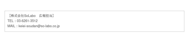 今後もSoLaboは、起業家や経営者が抱える様々な課題に対する解決策を、多角的に提案・提供していくために、解決の鍵となるパートナー企業様との連携強化を積極的に推進していく予定です。当社との提携をご希望される企業様は、以下へお問い合わせ下さい。