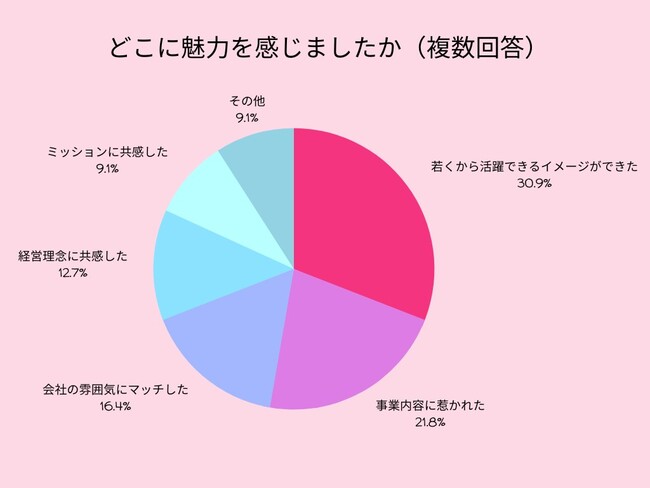 選考に進んだ学生に企業のどこに魅力を感じたかアンケートを取ったところ「若くから活躍できるイメージができた」30.9%「事業内容に惹かれた」21.8%「会社の雰囲気にマッチした」16.4%が上位3つの理由となっており、一緒に働く人、働きやすさ、キャリアイメージを重視している学生が大変多いことがわかりました。