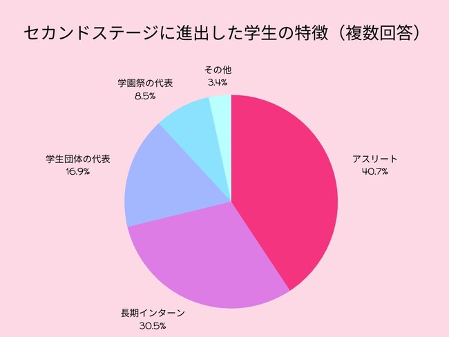 幹部候補セレクションは3ステージ勝ち抜き制となっています。アスリートや長期インターンの経験、学生団体や大学の学園祭の代表など自分にしかない強みを持った学生がセカンドステージへと進出しています。