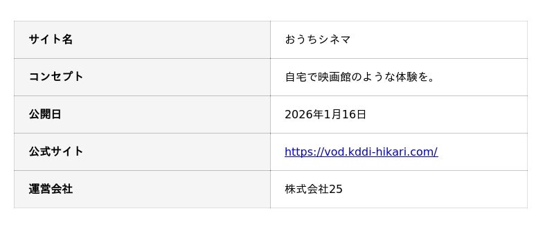 通信インフラ事業と地域振興事業を手掛ける株式会社ALL CONNECT(代表取締役社長:岩井 宏太/本社:福井県福井市)のグループ会社である株式会社25は、動画配信サービス(VOD)の比較や作品の配信情報など、エンターテインメントに関する役立つ情報を発信するWebメディア『おうちシネマ(https://vod-kddi-hikari.media.andco.group/)』の本格運用を開始いたしました。