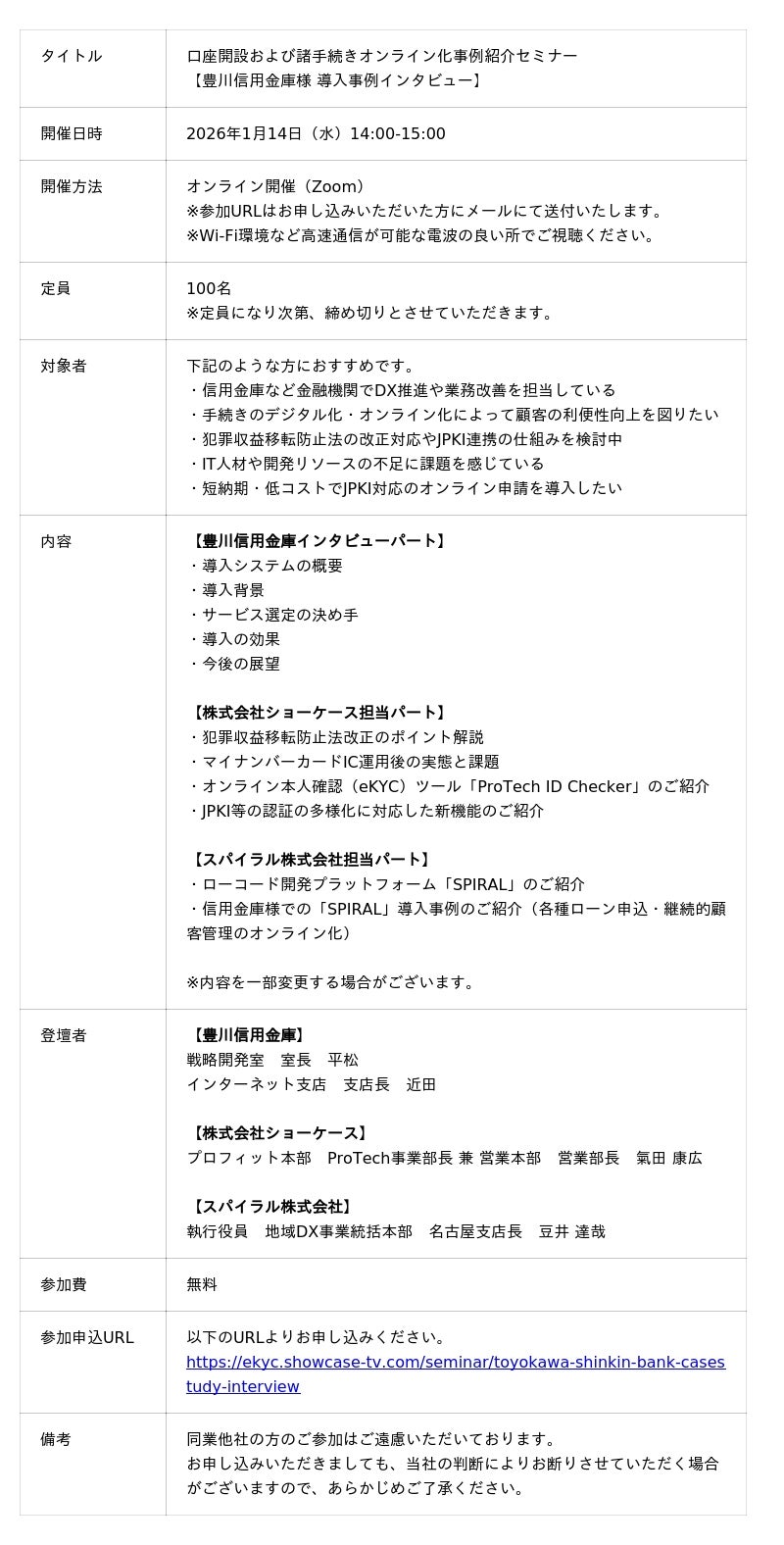 デジタルで未来最適をリードするスパイラル株式会社(東京都港区、代表取締役グループCEO 佐谷 宣昭)は、株式会社ショーケース(東京都港区、代表取締役社長 平野井 順一(以下「ショーケース」)と、信用金庫向けオンラインセミナー「口座開設および諸手続きのオンライン化事例紹介セミナー」を2026年1月14日(水)に開催いたします。本セミナーでは、当社が提供するローコード開発プラットフォーム「SPIRAL」とショーケースが提供するオンライン本人確認(eKYC)サービス「ProTech ID Checker」を連携し、短期間で口座開設に関する諸手続きをオンライン化した豊川信用金庫(愛知県豊川市、理事長 真田 光彦)の導入事例インタビューをご紹介します。