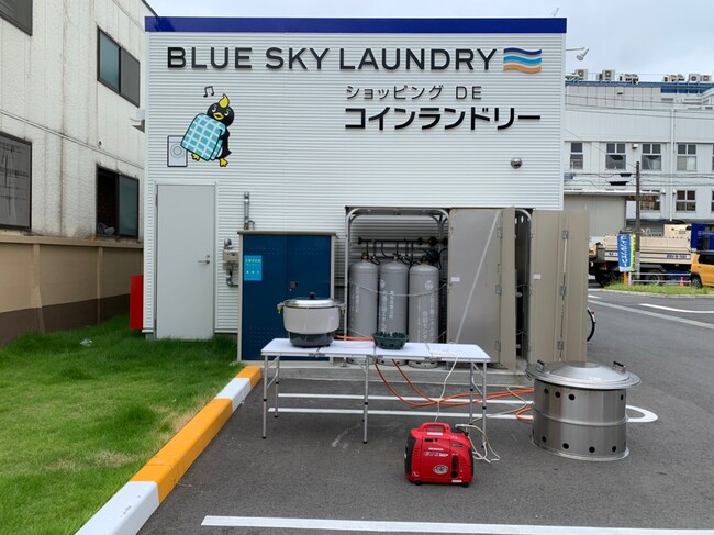 災害対応型ランドリーは「標準仕様」として3日分のLPガスを貯槽できるLPガスボンベ、ポータブル発電機への接続が可能な設備を完備します。ポータブル発電機はガスを利用して発電する仕組みになっており、携帯電話充電などへ電力供給することができます。また、店舗にガスコンロ、ガス炊飯器を導入し、被災者向けの炊き出しが可能になります。昨今の社会情勢により三密回避に向けた分散避難が必要となる中、コインランドリーを“一時避難所“として活用する事ができます。なお、今回のオープン店舗を含む216店舗中99店舗が災害対応型コインランドリーとして機能しています。