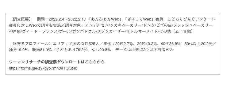 園児とママの情報誌「あんふぁん」「ぎゅって」を発行する株式会社こどもりびんぐ(所在地:東京都千代田区、代表取締役:中島一弘)は、「シルミル研究所」としてリサーチ事業を展開しています。「シルミル研究所」では、女性を対象にした調査「ウーマンリサーチ」を実施し、女性が選ぶおすすめの商品やサービスをランキング形式で、Webコンテンツとして発信しています。今回は2022年2月に実施した「ベーカリーチェーン」についての調査結果を発表いたします。