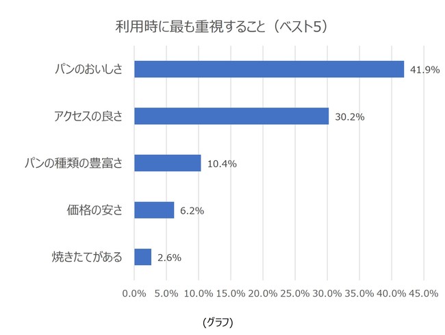 ベーカリーチェーンを利用する際に最も重視するポイントは、「パンのおいしさ」が41.9%と最も多く、「アクセスの良さ」、「パンの種類の豊富さ」と続きました(グラフ)。