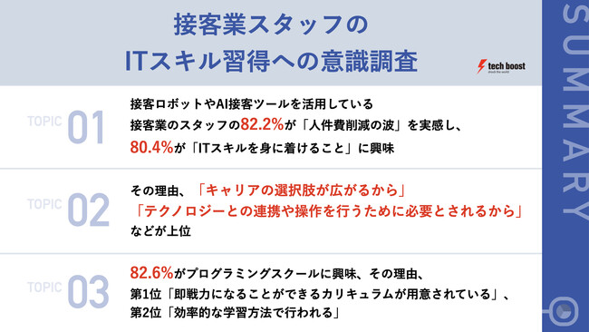 まず、接客ロボットやAI接客ツールの導入により、接客業スタッフの82.2%が「サービス業全体の人件費削減の波」を実感し、更には8割以上のスタッフが自身のキャリアを不安視していることが明らかとなりました。そんな中「キャリアの選択肢が広がるから」(64.0%)や「テクノロジーとの連携や操作を行うために必要とされるから」(51.2%)などの理由で、8割以上が「ITスキルを身に着けること」に興味を示していることが判明しました。