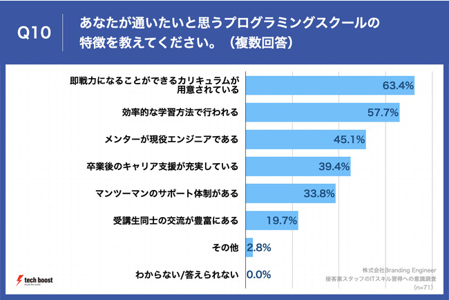 Q9で「非常に興味がある」「やや興味がある」と回答した方に、「Q10.あなたが、通いたいと思うプログラミングスクールの特徴を教えてください。(複数回答)」(n=71)と質問したところ、「即戦力になることができるカリキュラムが用意されている」が63.4%、「効率的な学習方法で行われる」が57.7%、「メンターが現役エンジニアである」が45.1%という回答となりました。