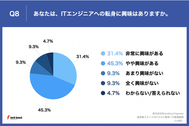 Q3で「非常に興味がある」「やや興味がある」と回答した方に、「Q8.あなたは、ITエンジニアへの転身に興味はありますか。」(n=86)と質問したところ、「非常に興味がある」が31.4%、「やや興味がある」が45.3%という回答となりました。