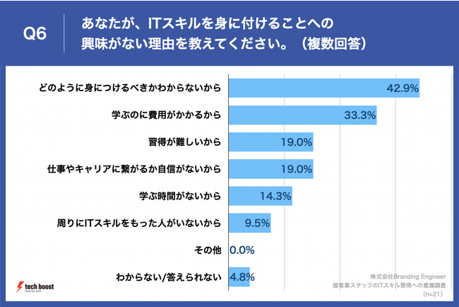 Q3で「あまり興味がない」「全く興味がない」と回答した方に、「Q6.あなたが、ITスキルを身に付けることへの興味がない理由を教えてください。(複数回答)」(n=21)と質問したところ、「どのように身につけるべきかわからないから」が42.9%、「学ぶのに費用がかかるから」が33.3%、「習得が難しいから」が19.0%という回答となりました。