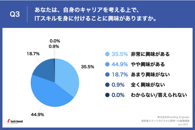 「Q3.あなたは、自身のキャリアを考える上で、ITスキルを身に付けることに興味がありますか。」(n=107)と質問したところ、「非常に興味がある」が35.5%、「やや興味がある」が44.9%という回答となりました。