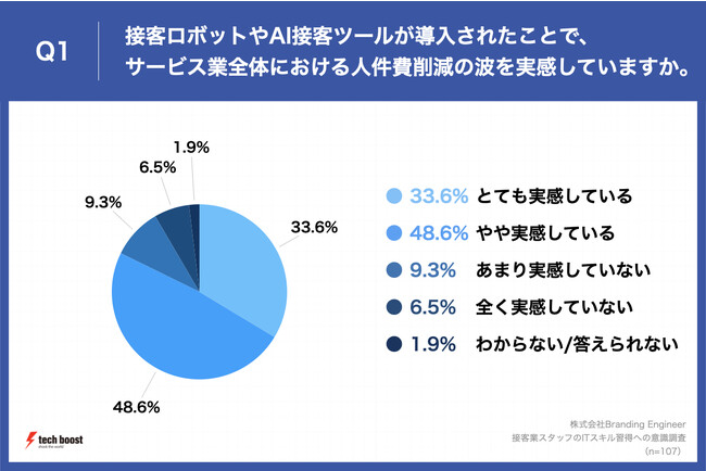 「Q1.接客ロボットやAI接客ツールが導入されたことで、サービス業全体における人件費削減の波を実感していますか。」(n=107)と質問したところ、「とても実感している」が33.6%、「やや実感している」が48.6%という回答となりました。