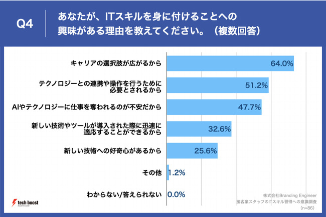 Q3で「非常に興味がある」「やや興味がある」と回答した方に、「Q4.あなたが、ITスキルを身に付けることへの興味がある理由を教えてください。(複数回答)」(n=86)と質問したところ、「キャリアの選択肢が広がるから」が64.0%、「テクノロジーとの連携や操作を行うために必要とされるから」が51.2%、「AIやテクノロジーに仕事を奪われるのが不安だから」が47.7%という回答となりました。