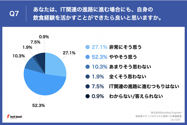 「Q7.あなたは、IT関連の進路に進む場合にも、自身の飲食経験を活かすことができたら良いと思いますか。」(n=107)と質問したところ、「非常にそう思う」が27.1%、「ややそう思う」が52.3%という回答となりました。